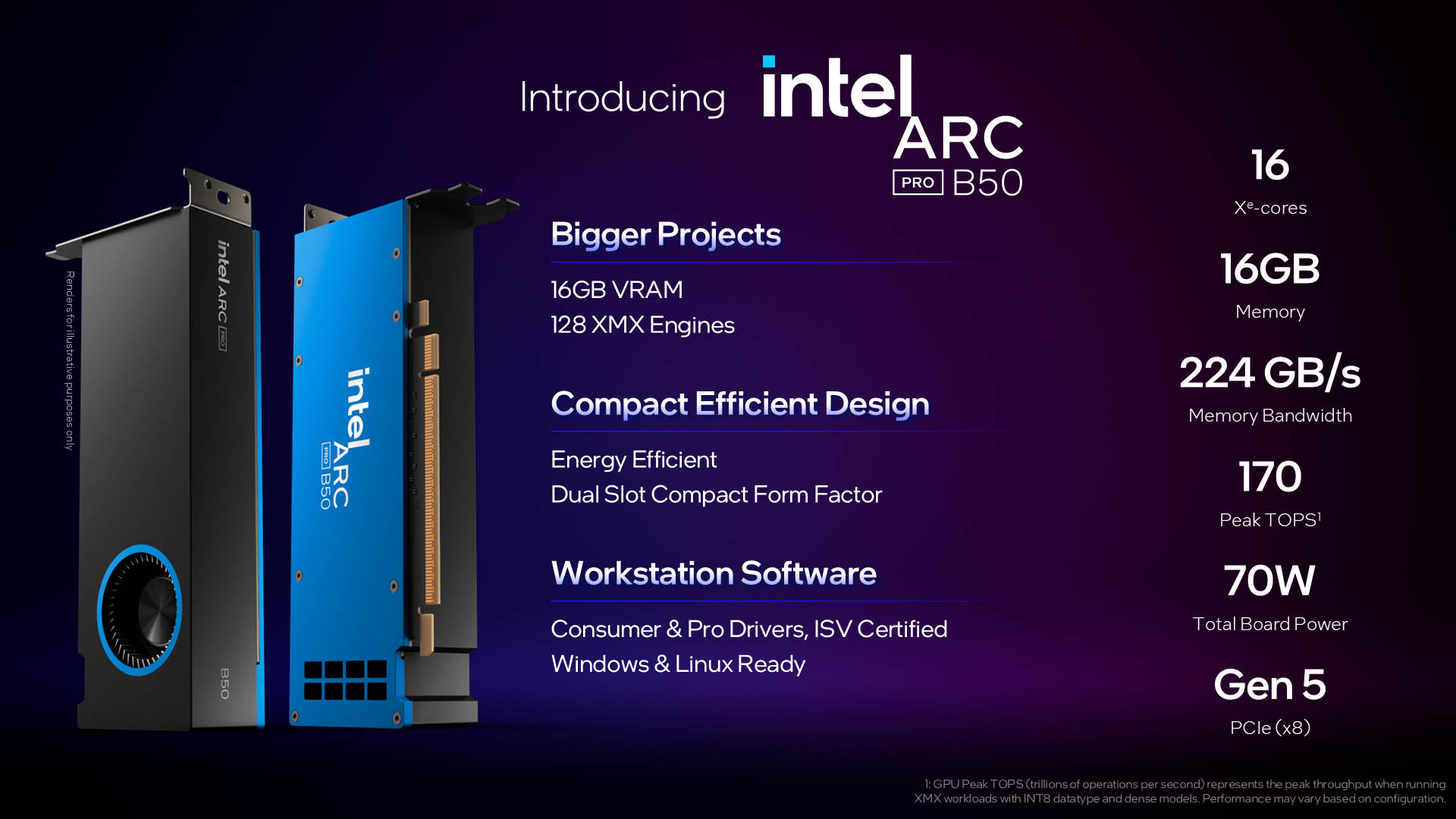 Priced at $299 MSRP, the Arc Pro B50 competes directly with the Nvidia RTX A1000 (8 GB) — but, as Intel highlights, it offers double the memory.