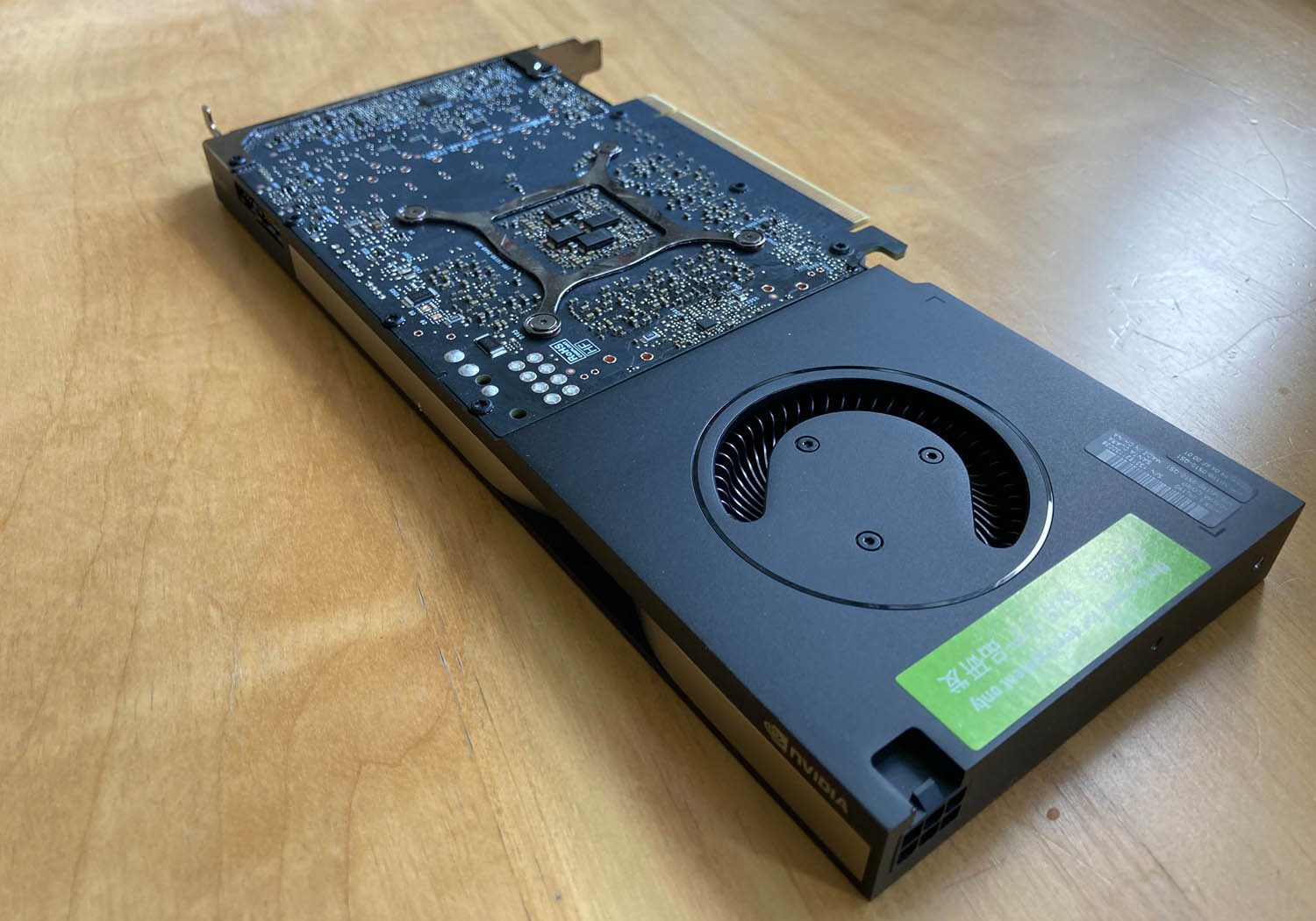 The board features four DisplayPort 1.4a ports and can drive up to four displays at 5K resolution. It is cooled by a single ‘blower’ type fan, which draws in cool air from the top and bottom of the card, pushes it through a radiator and then directly out of the rear of the workstation chassis. This is in contrast to most consumer GeForce GPUs which use axial fans that recirculate air inside the machine.