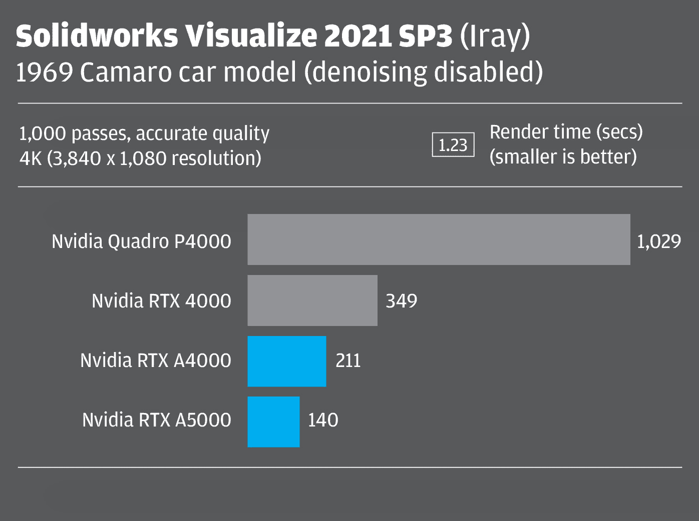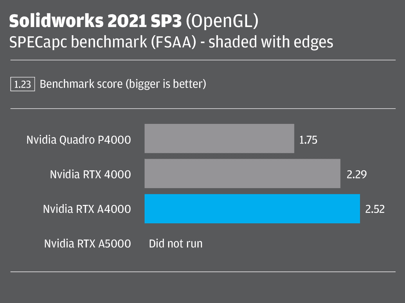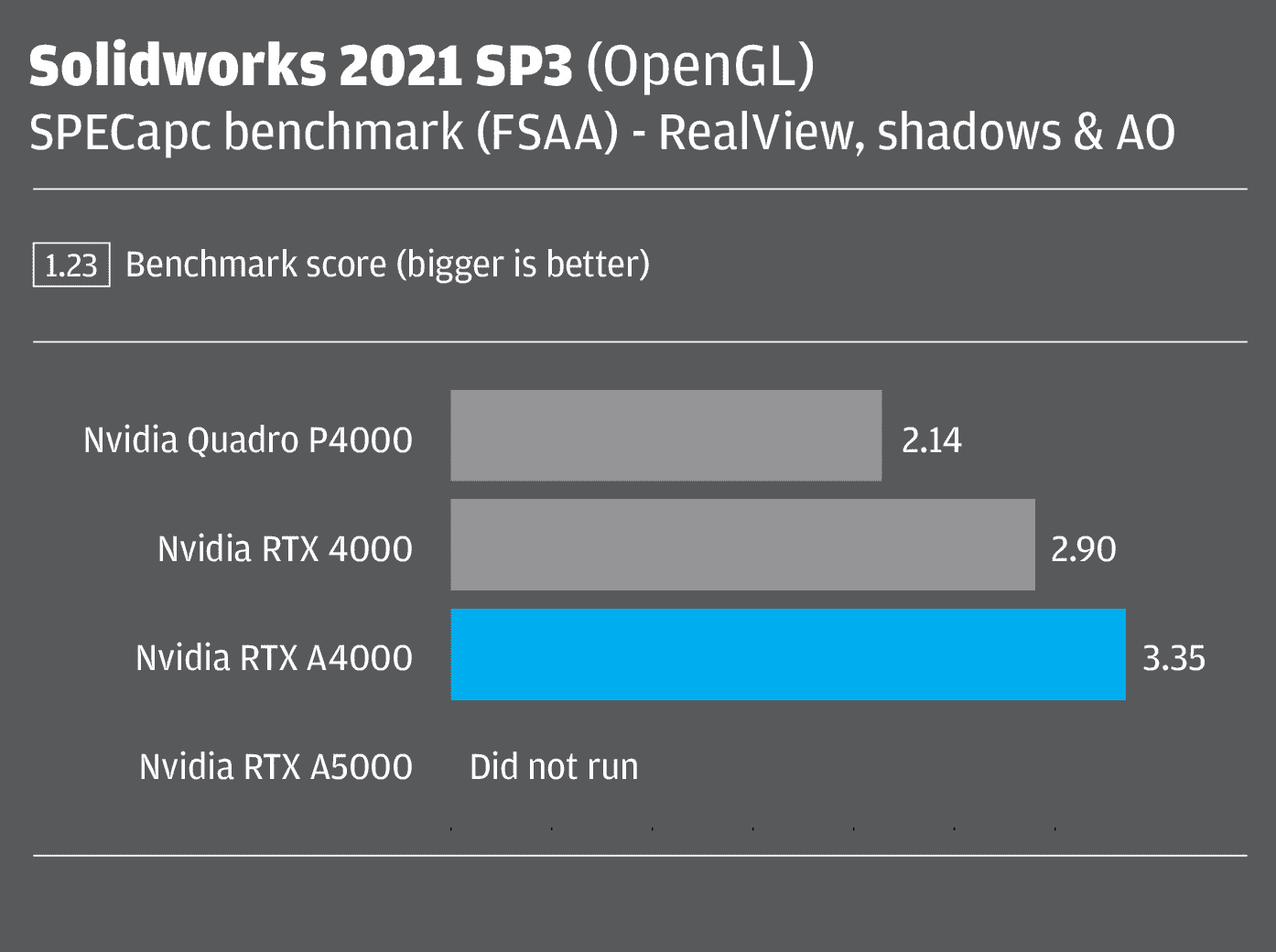 We were unable to test the Nvidia RTX A5000 as Solidworks 2021 SP3 did not recognise the card. We expect this to be fixed in SP4, out soon.