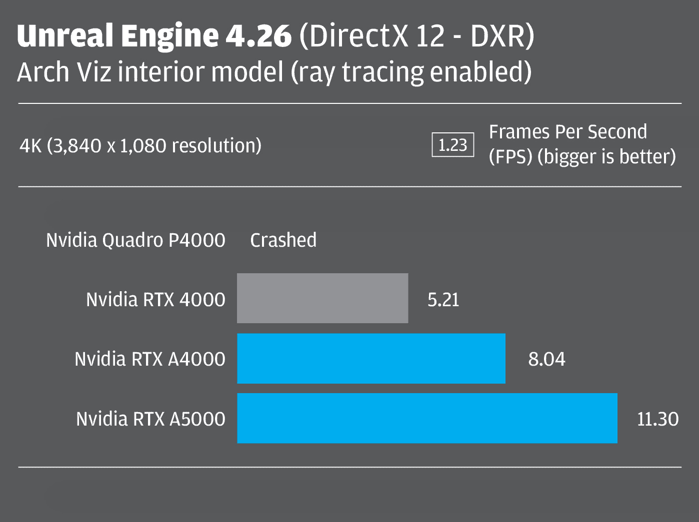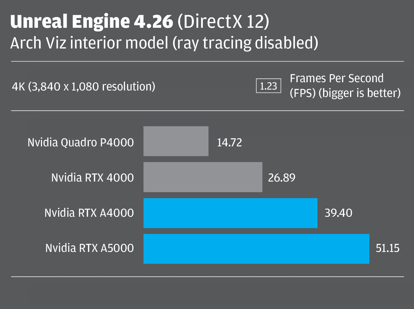 While GPU rendering is a major play for the Nvidia RTX A4000 and Nvidia RTX A5000, real-time 3D using OpenGL, DirectX and (in the future) Vulkan continues to be a very important part of architectural visualisation, with applications including TwinMotion, Lumion, Enscape, Unreal Engine, LumenRT and others.