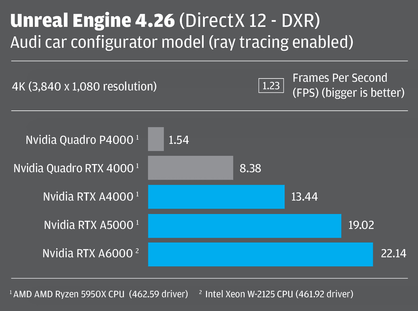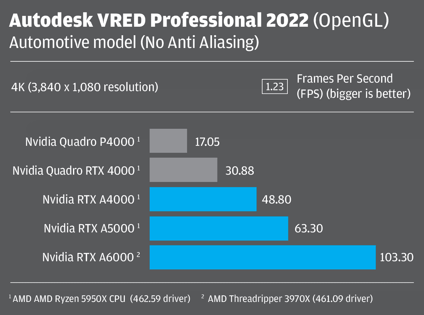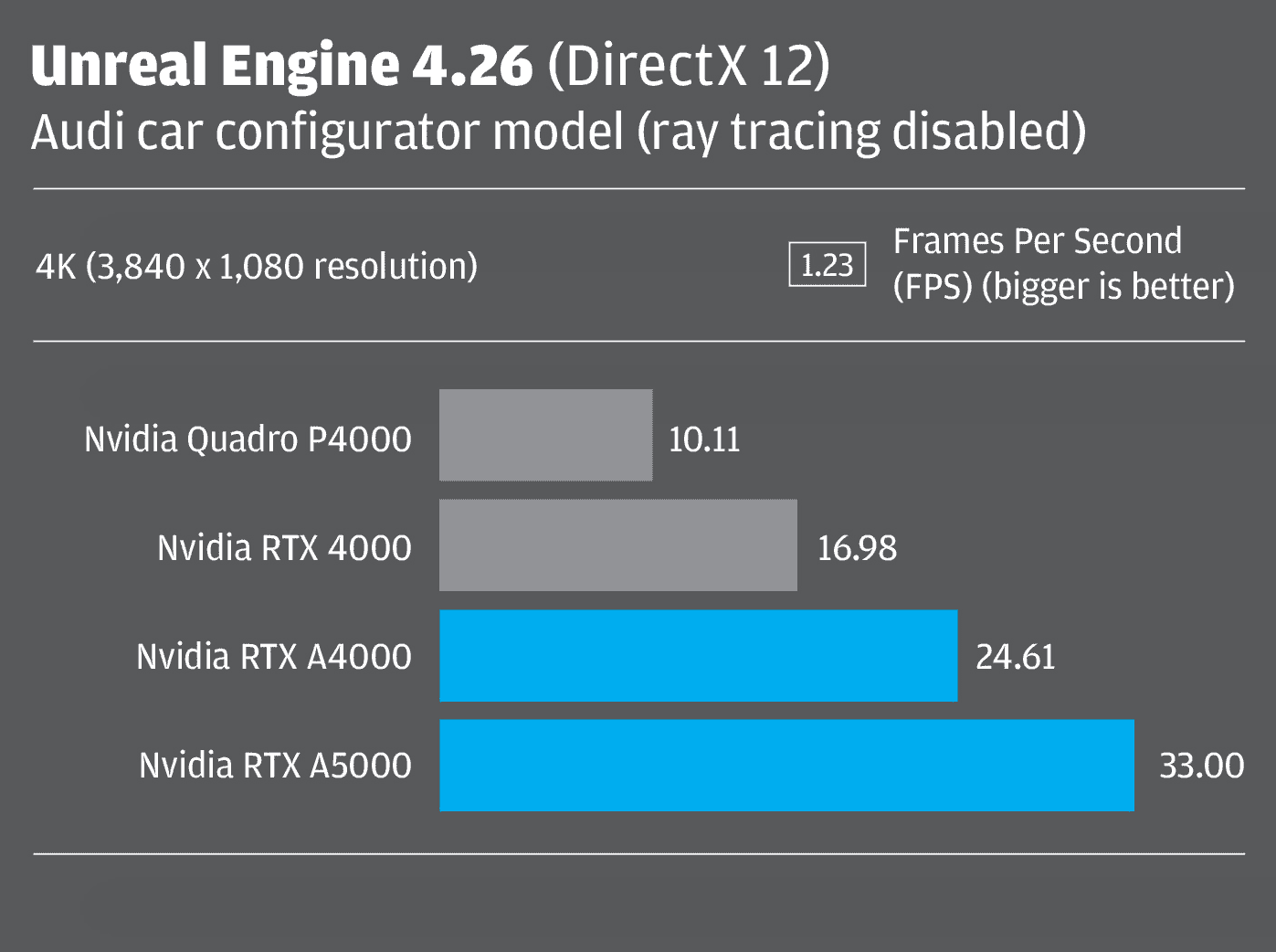 In terms of performance, the Nvidia RTX A4000 and A5000 delivered a very smooth experience with 30 and 40 FPS respectively. This is around twice as fast as the Nvidia Quadro RTX 4000 and three to four times faster than the Nvidia Quadro P4000.
