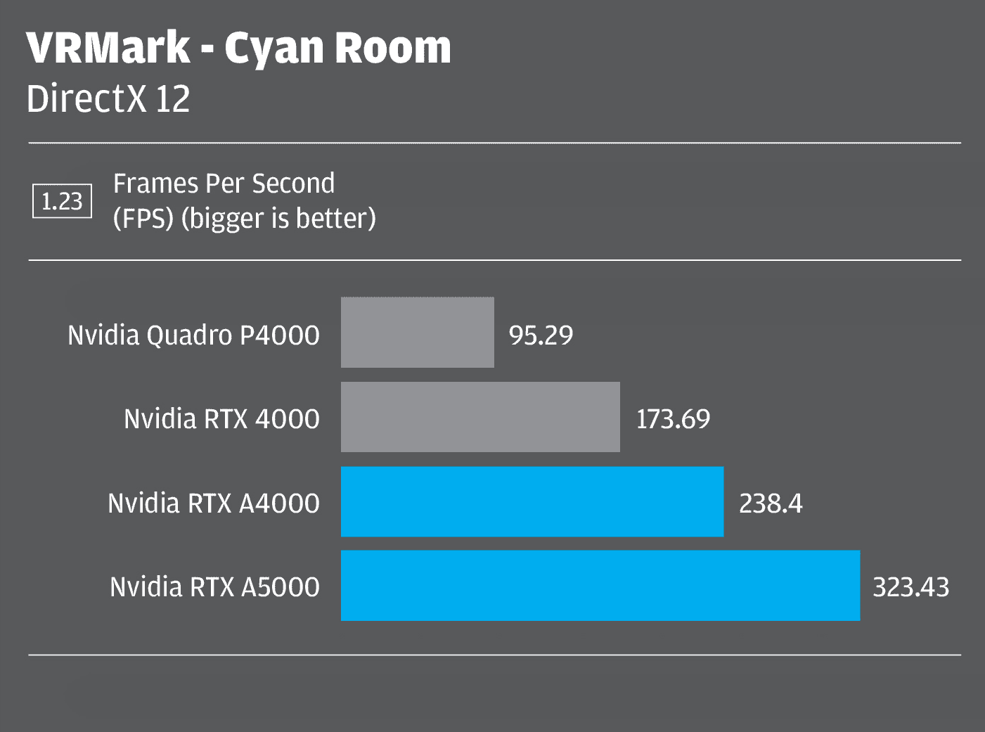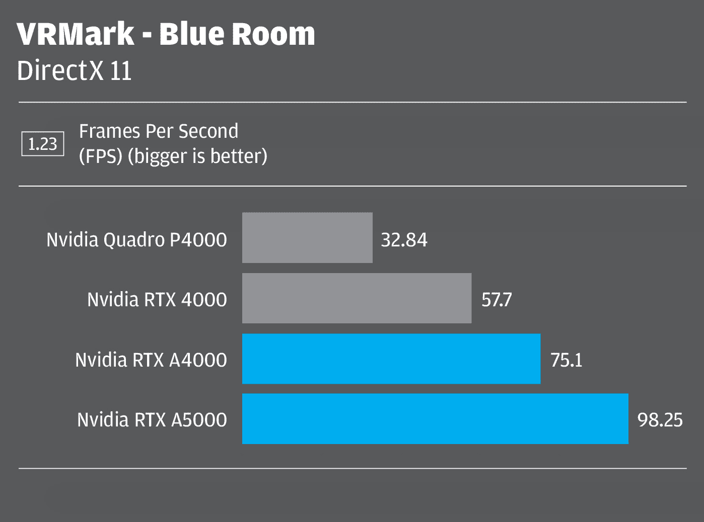 We also tested with VRMark, a dedicated Virtual Reality benchmark that uses both DirectX 11 and DirectX 12. It’s biased towards 3D games, so not perfect for our needs, but should give a good indication of the performance one might expect in ‘game engine’ viz tools.